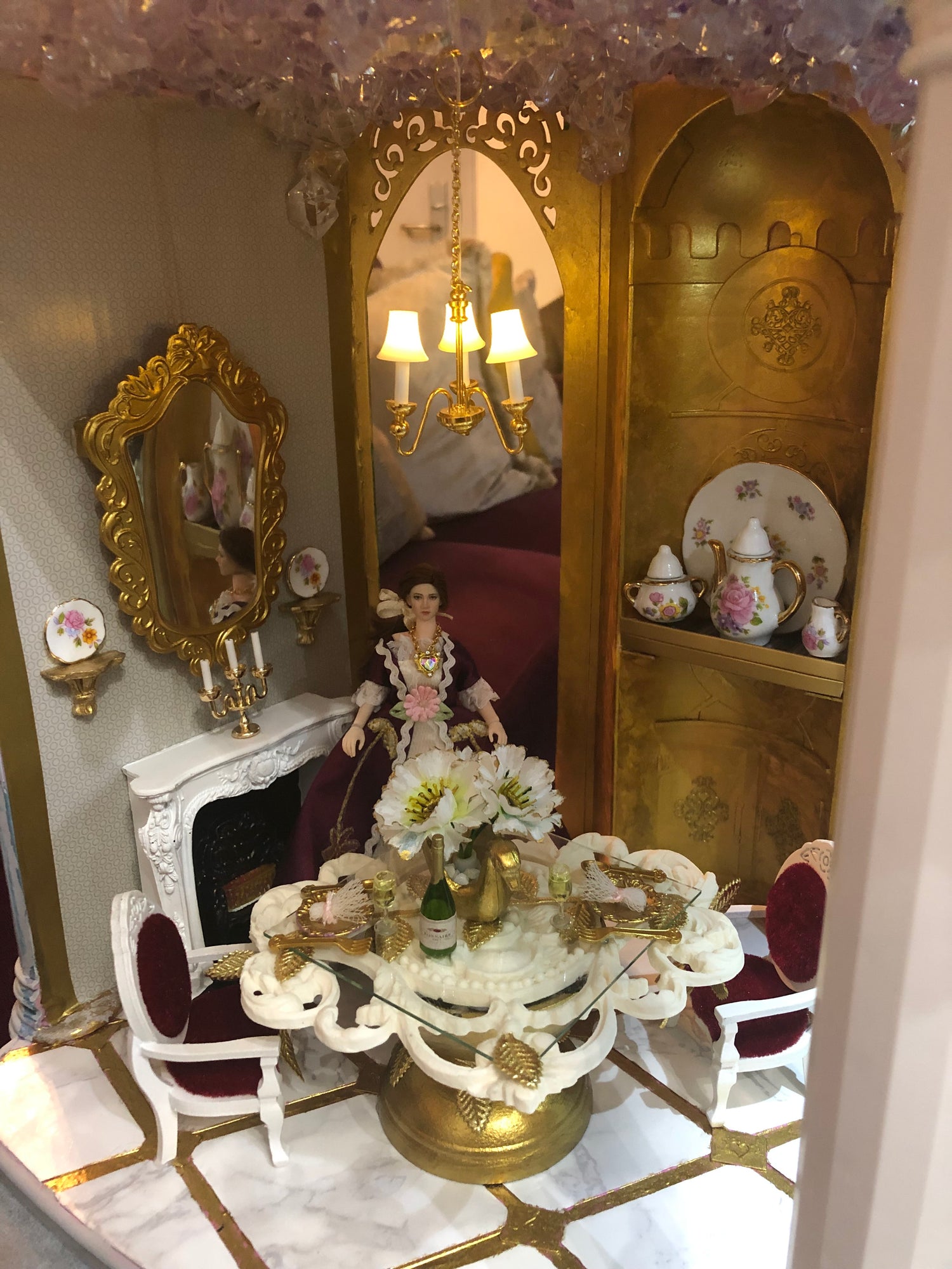 This elegantly decorated dollhouse was designed by miniaturist Francine Burgos, who specializes in refurbishing dollhouses. The stunning dining table is made from our Large Flower Vine Ceiling Carving.