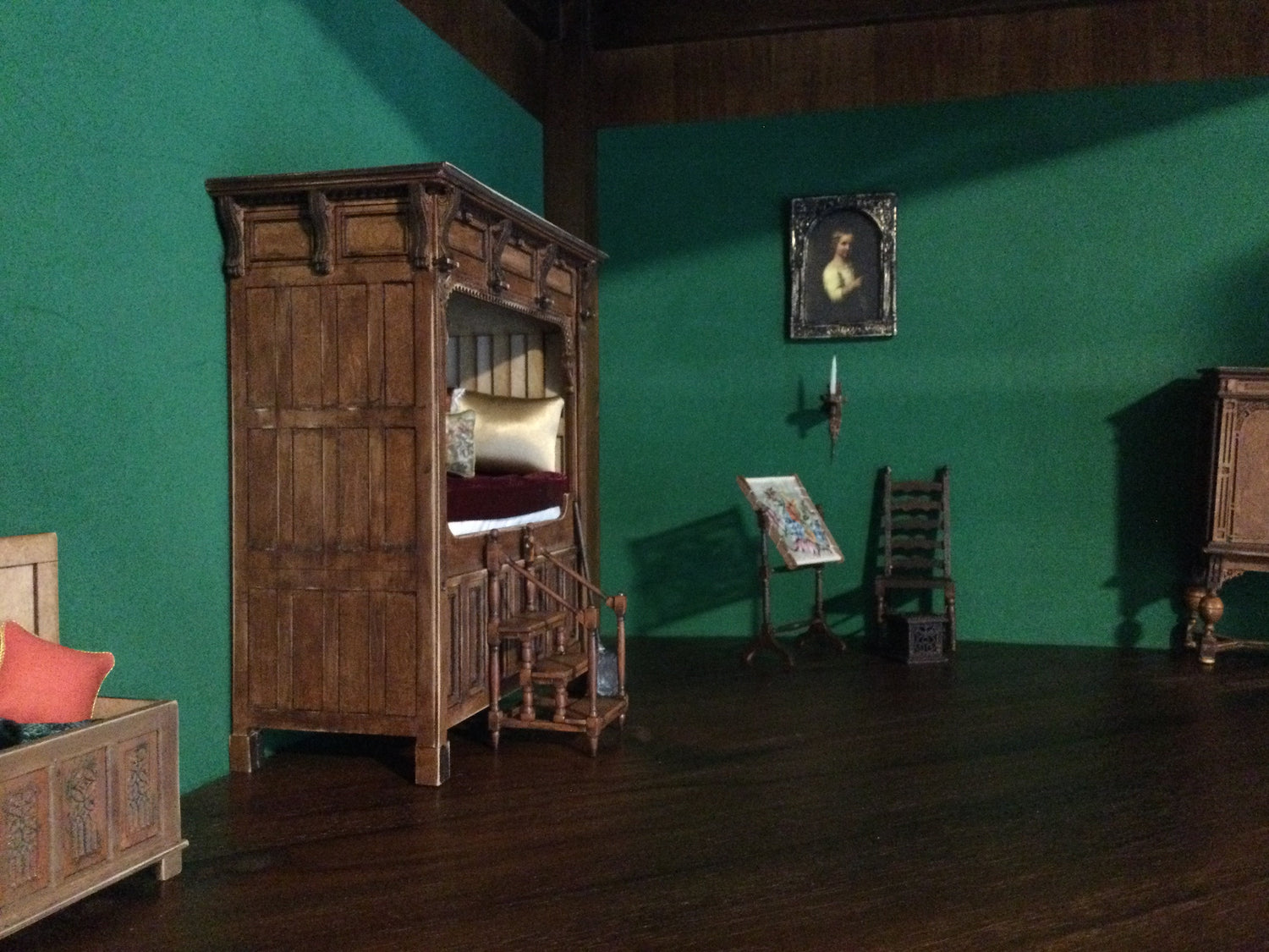 This adorable and cozy miniature build made by Jan Augustyn, one of our customers, features one of Unique Miniatures' ornate gold mirrors (pictured on the wall above the framed art print).