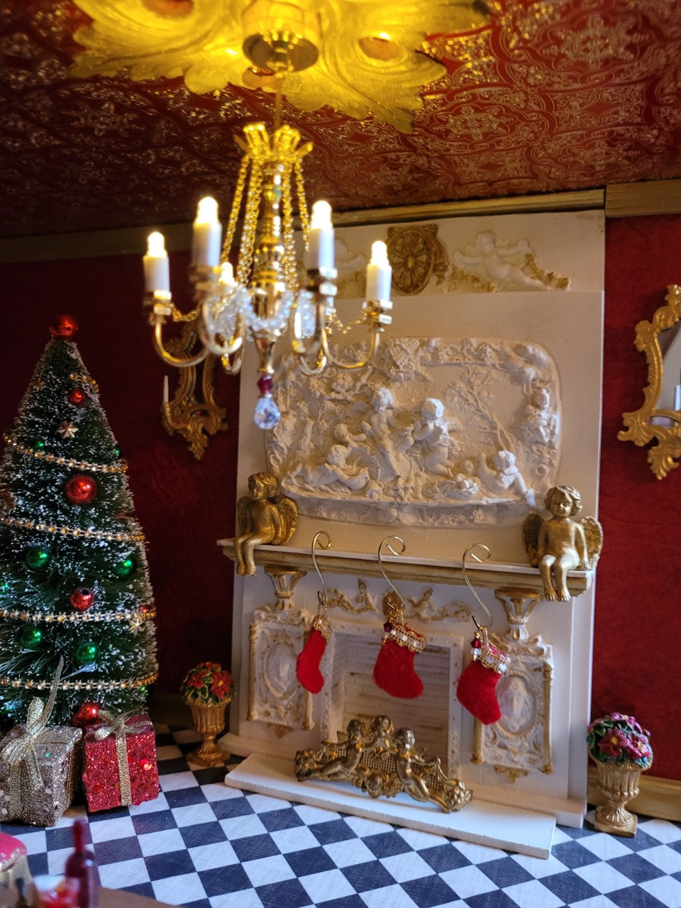 This cozy, festive built was created by Kelly Ludwig, and features our Large Cherub Fireplace as well as our Large Fern Medallion, which has been painted gold and used as a base for the chandelier.