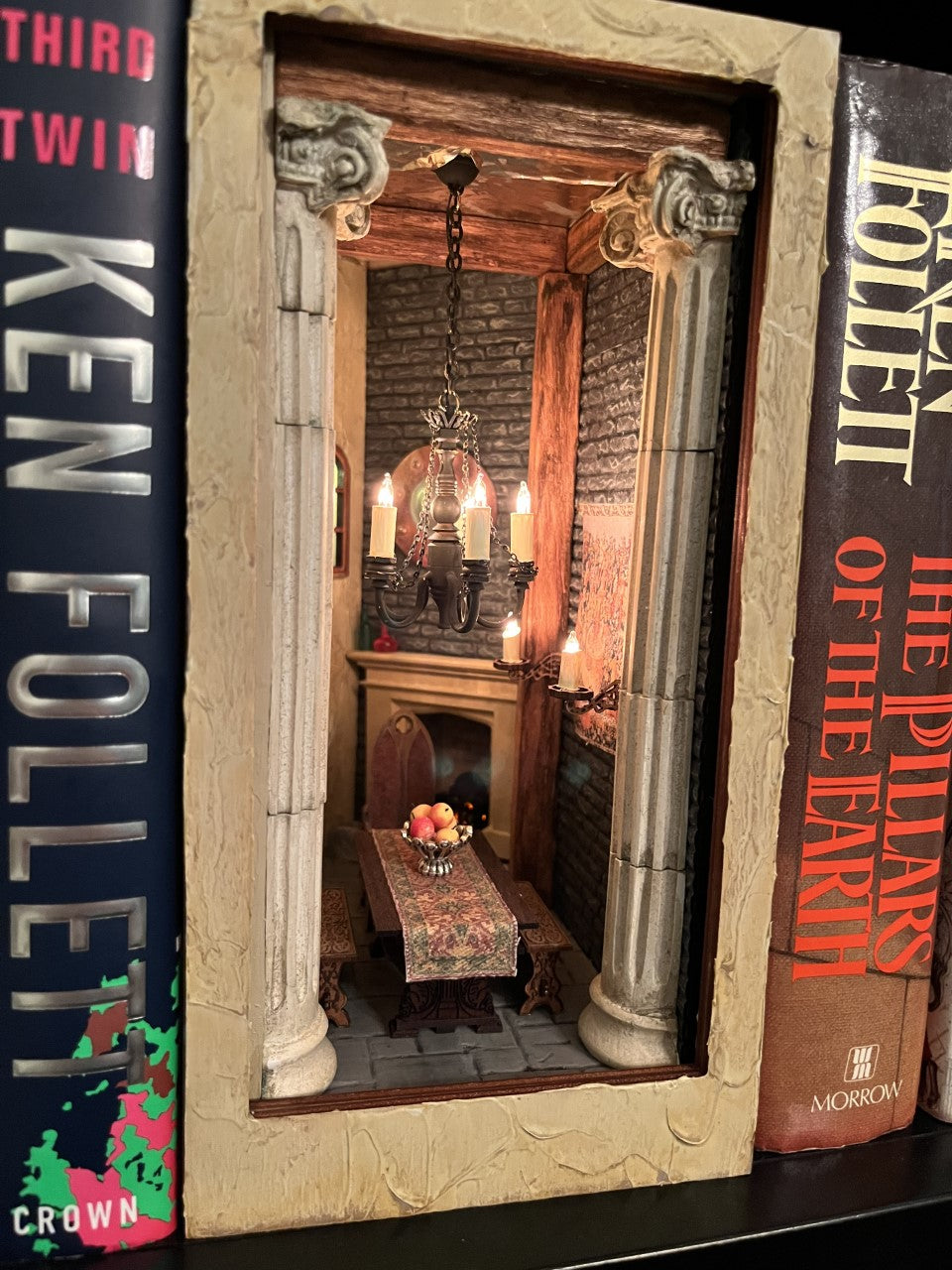 This miniature book nook is titled "King Ecbert's Dining Hall" and is inspired by King Ecbert of Wessex who often lived in a Roman estate, effectively mixing Roman and English decoration styles. This piece features two of Unique Miniatures' large columns (located at the very front).
