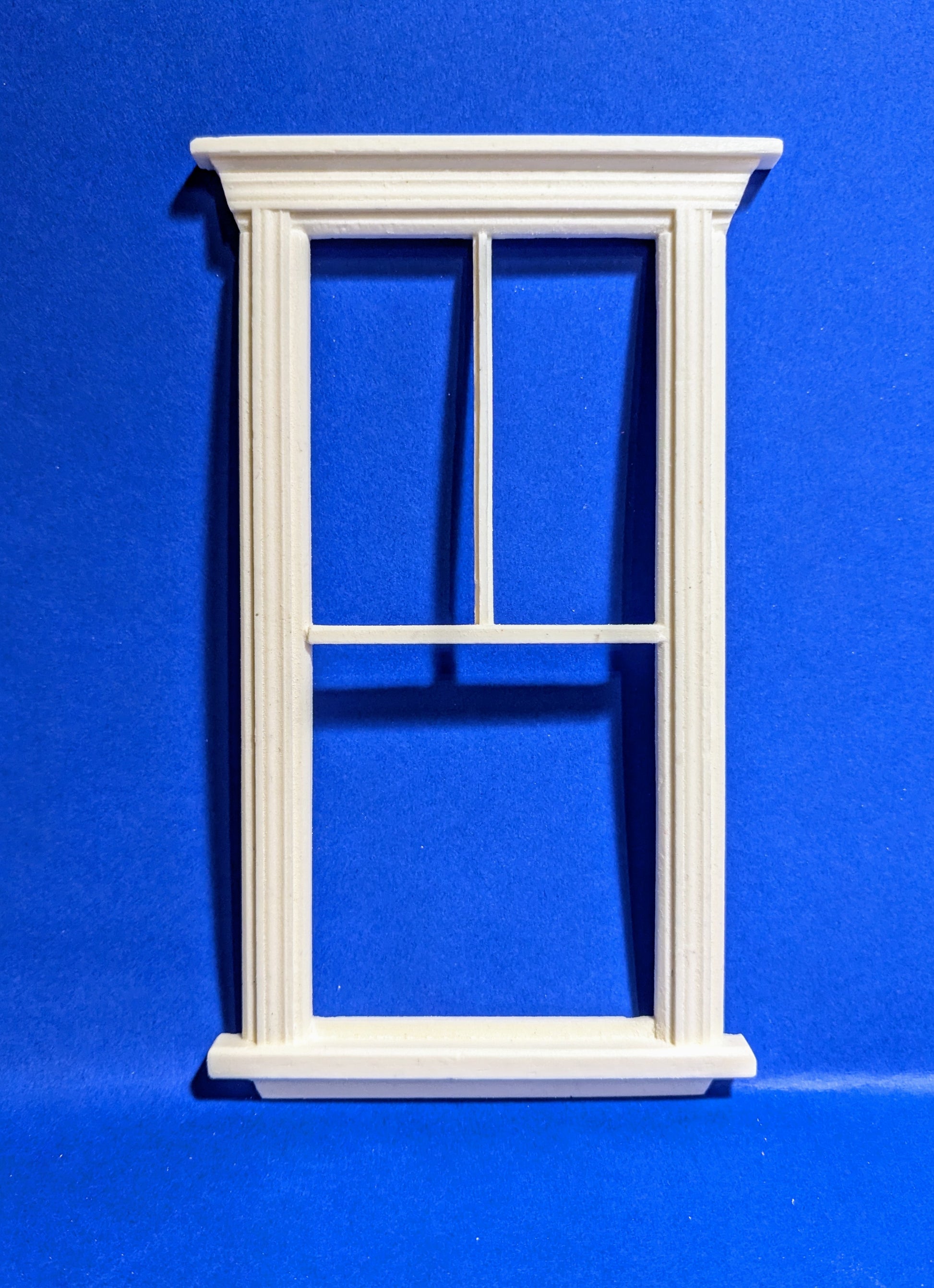 Clean, simple, modern lines make this window a standout! Our newest window features farmhouse architectural detail for the modern dollhouse and miniature enthusiast. The full piece measures 4" x 6 5/8*. The interior of the upper panes measure 1 1/8" x 2 5/8" and the bottom pane is 2 3/8" wide by 2 5/8" high.