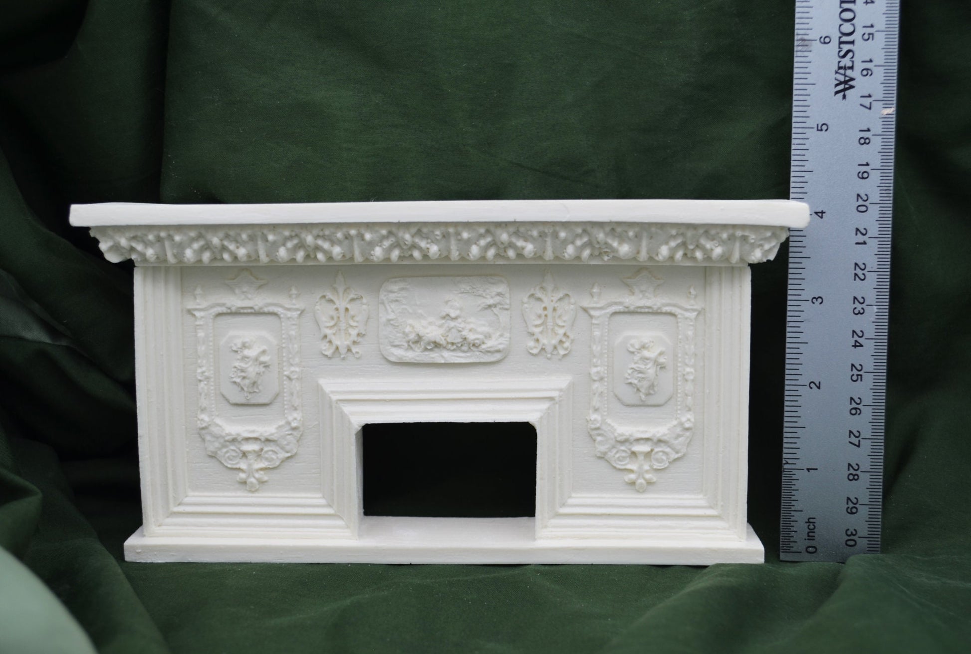 Bring warmth and elegance into your dollhouse or miniature with this baroque fireplace. The piece measure 8-1/2" W X 4-3/8" H X 1-3/4" D.