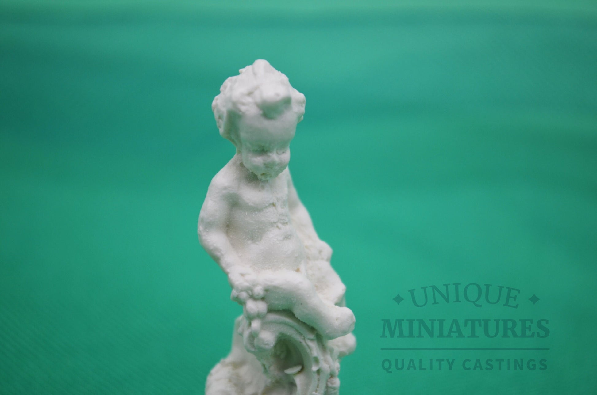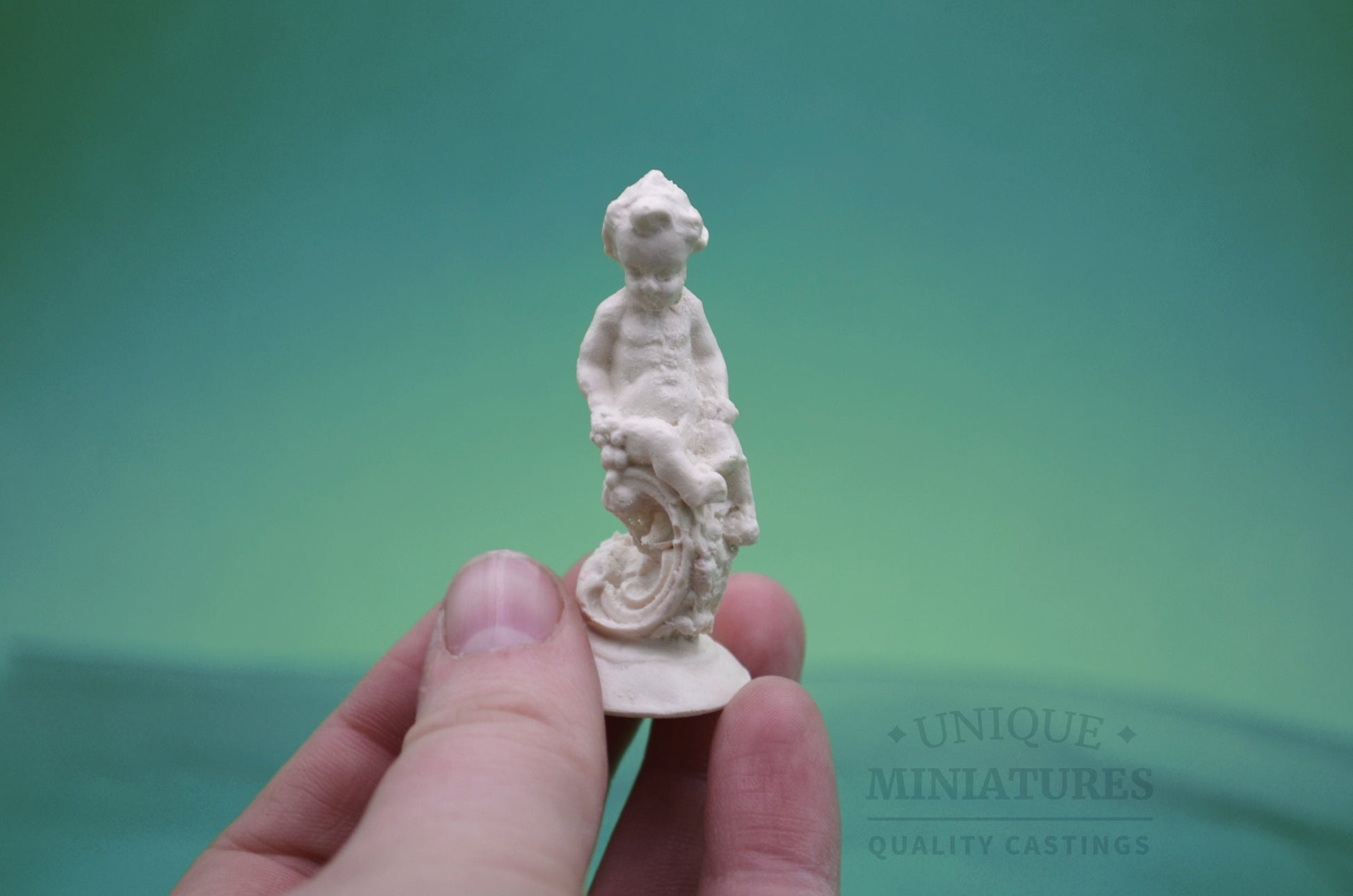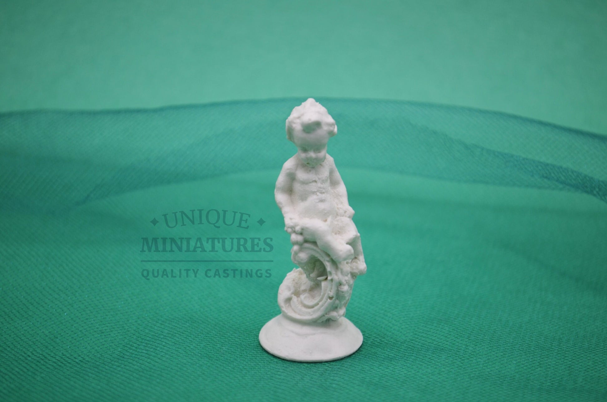 Bring whimsy and charm to any fairy garden, miniature, or dollhouse! This miniature statue, standing 2 1/8 inches tall. It represents a cherub baby draped in grapes atop a wave, reminiscent of ancient Greco-Roman sculptures.