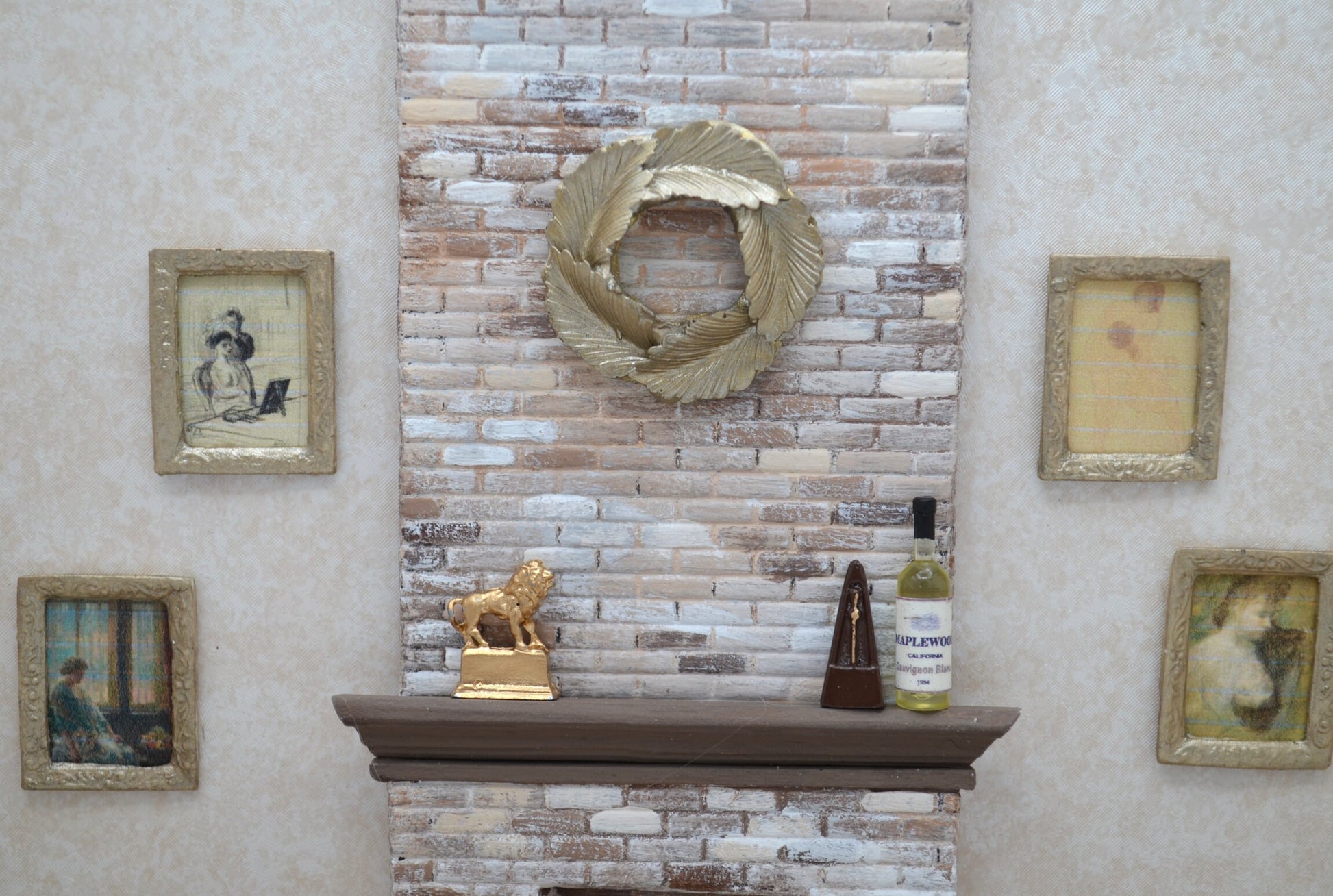 The fireplace, wreath, mantle, and picture frames are hand poured from resin by Unique Miniatures. The wine bottle is made by Hudson River Miniatures. The Metronome and Lion Statue are made by Island Craft.