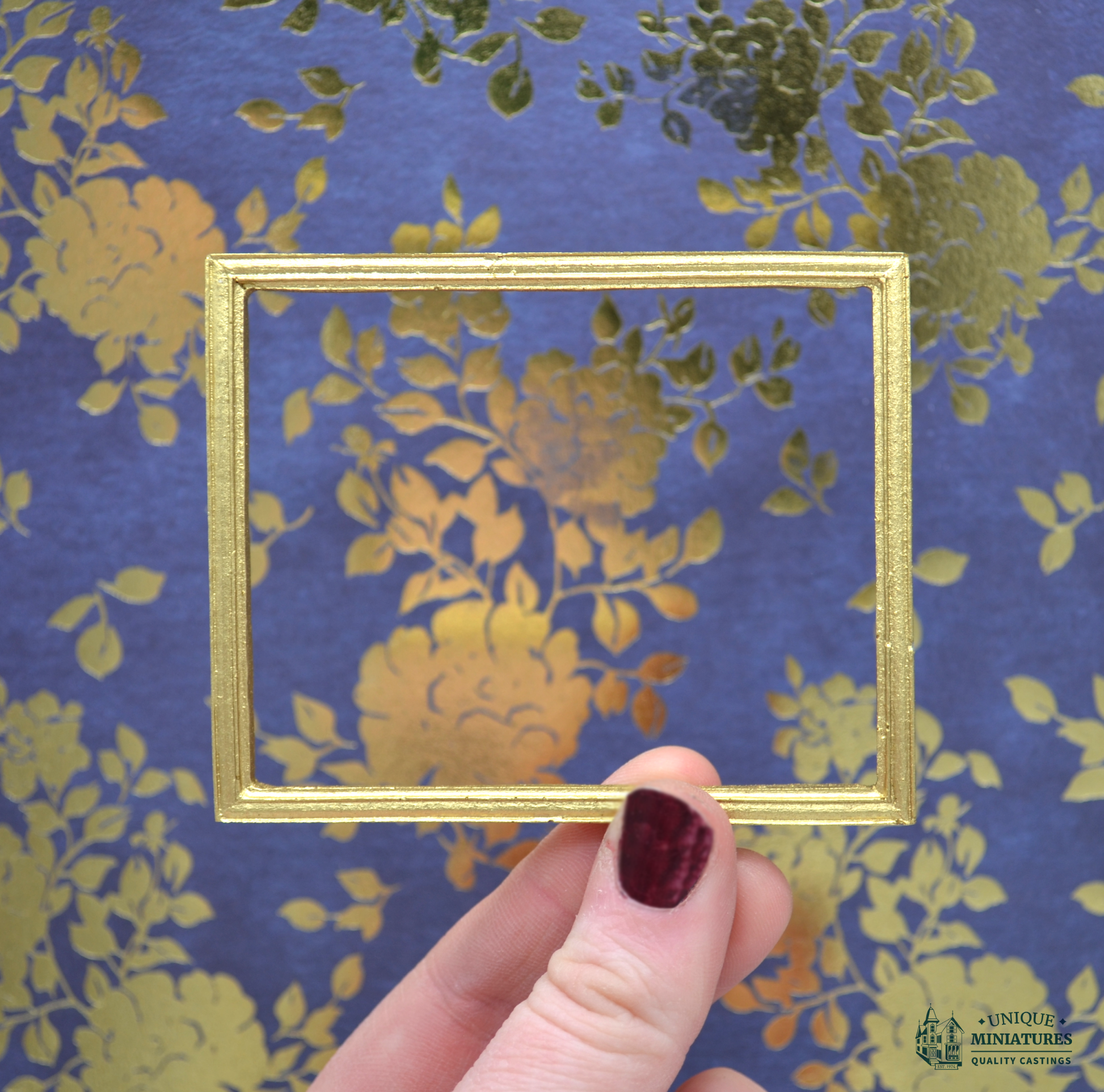 This gilded miniature frame is 3.5" wide by 2.75”. Any of our frames can be modified into a mirror which is made of a highly-reflective, lightweight vinyl with self-adhesive backing — mirrored surface looks like glass, but less fragile.