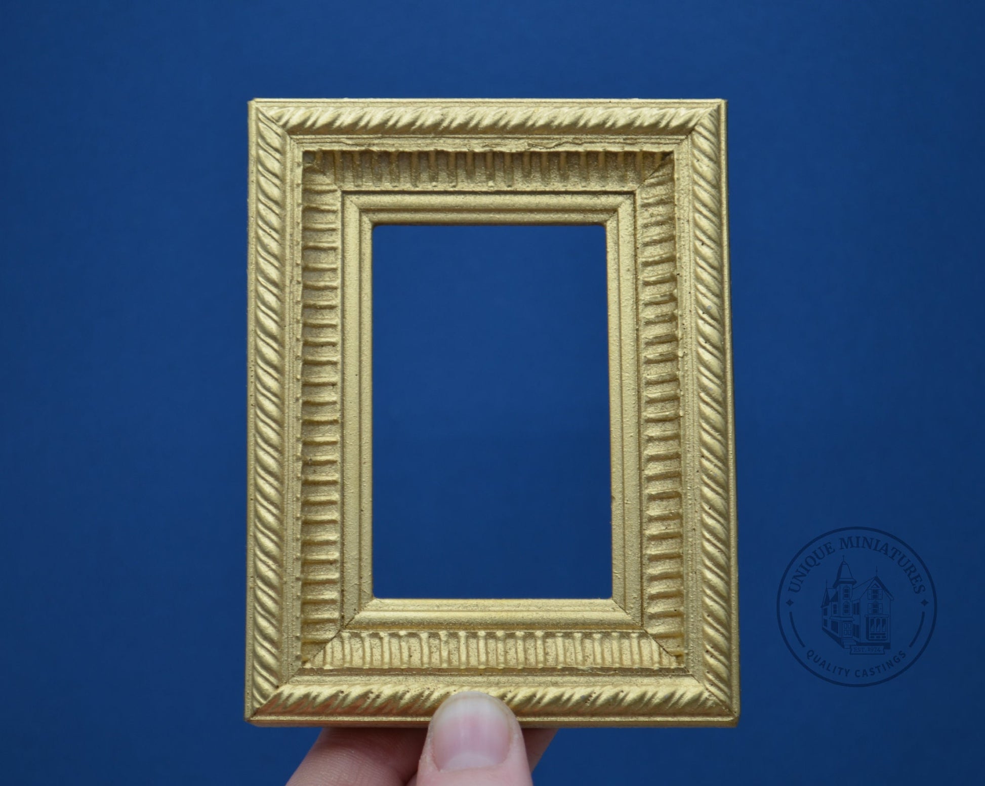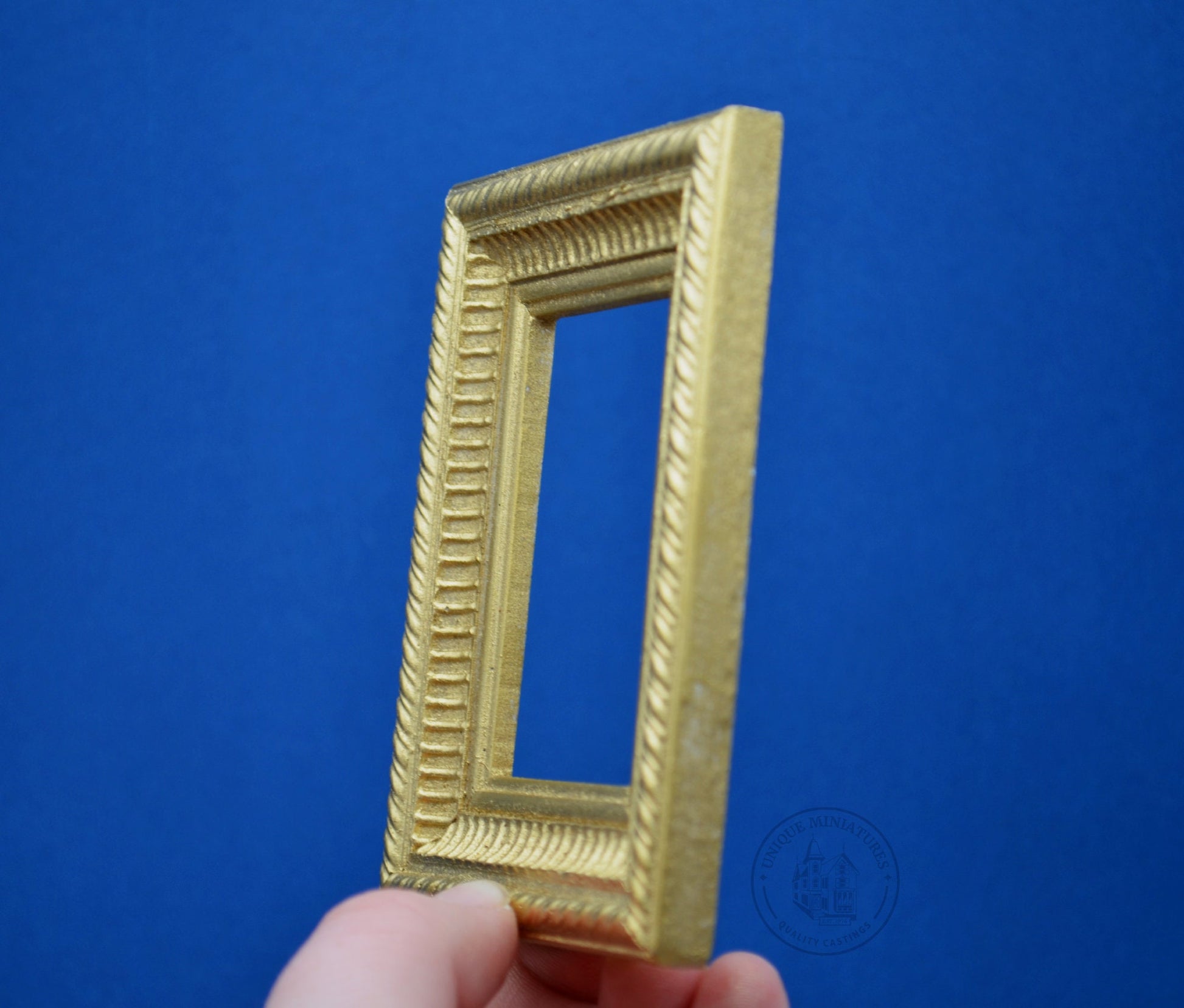 This gilded miniature swooped frame is the perfect compliment to any small piece of art or photograph. The full piece measures 4" X 3" wide on the outside and 2 7/16" x 1 1/2" on the inside with a depth of 7/16". Any of our frames can be modified into a mirror which is made of a highly-reflective, lightweight vinyl with self-adhesive backing — mirrored surface looks like glass, but less fragile.