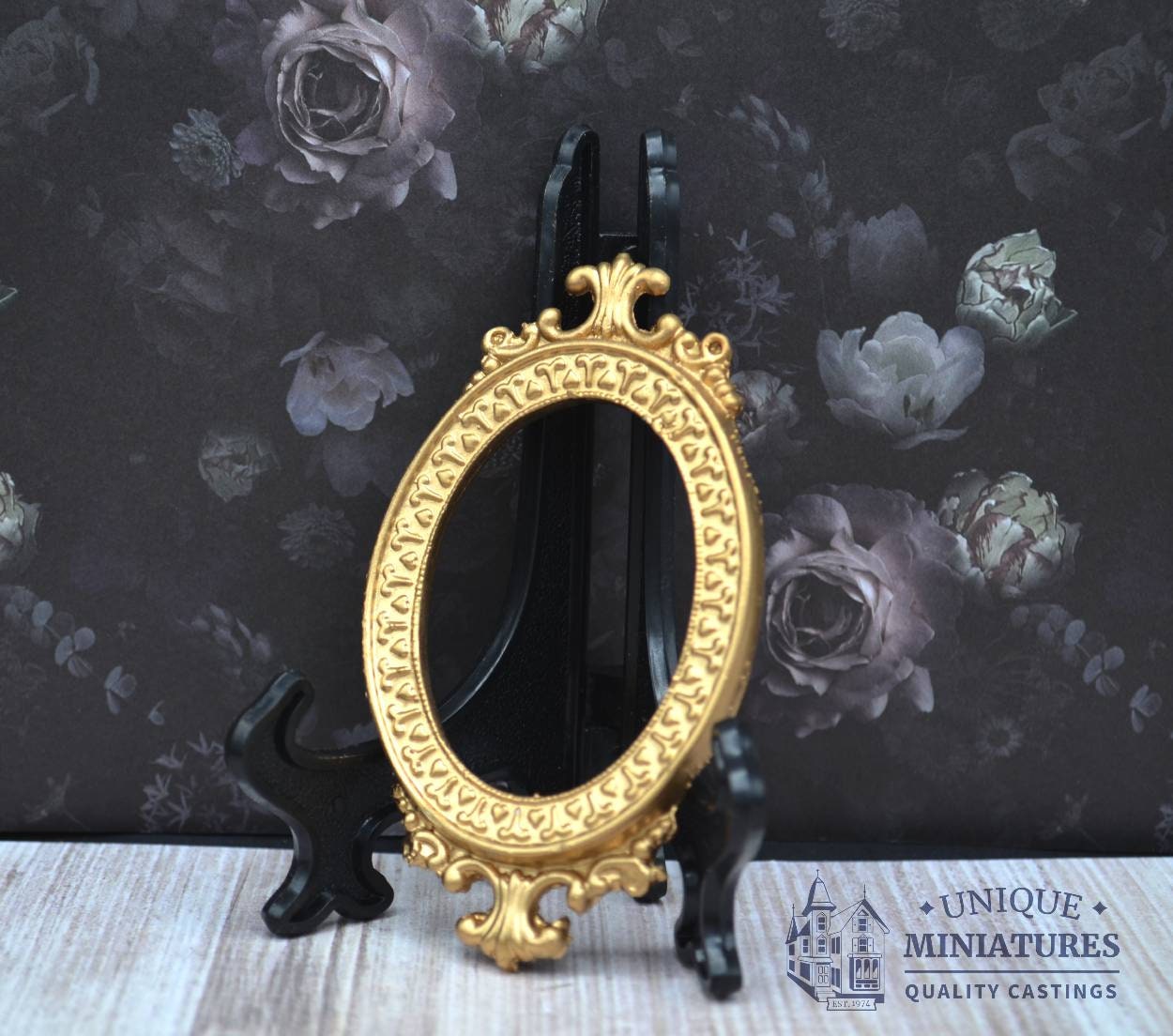 This sleek gilded oval frame will bring elegance to any dollhouse or miniature project. This frame measures 2" wide x 3-1/2". Any of our frames can be modified into a mirror which is made of a highly-reflective, lightweight vinyl with self-adhesive backing — mirrored surface looks like glass, but less fragile.
