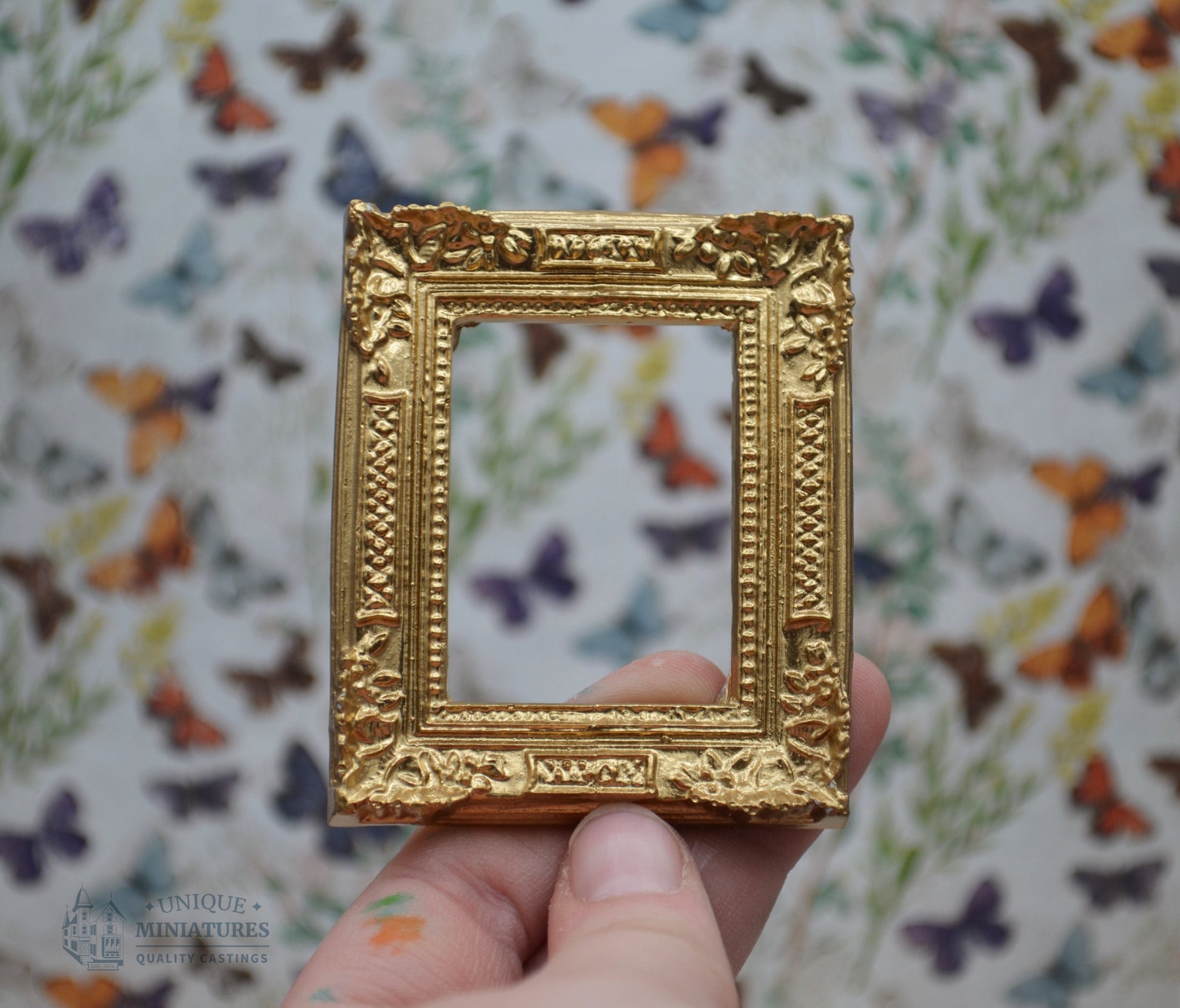This sleek gilded oval frame will bring elegance to any dollhouse or miniature project. This frame measures 2-3/8" x 2-3/4 ". Any of our frames can be modified into a mirror which is made of a highly-reflective, lightweight vinyl with self-adhesive backing — mirrored surface looks like glass, but less fragile.
