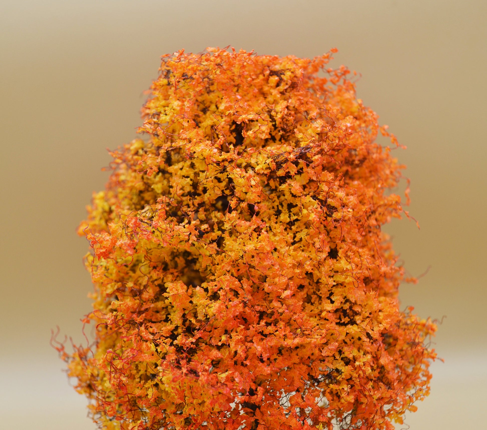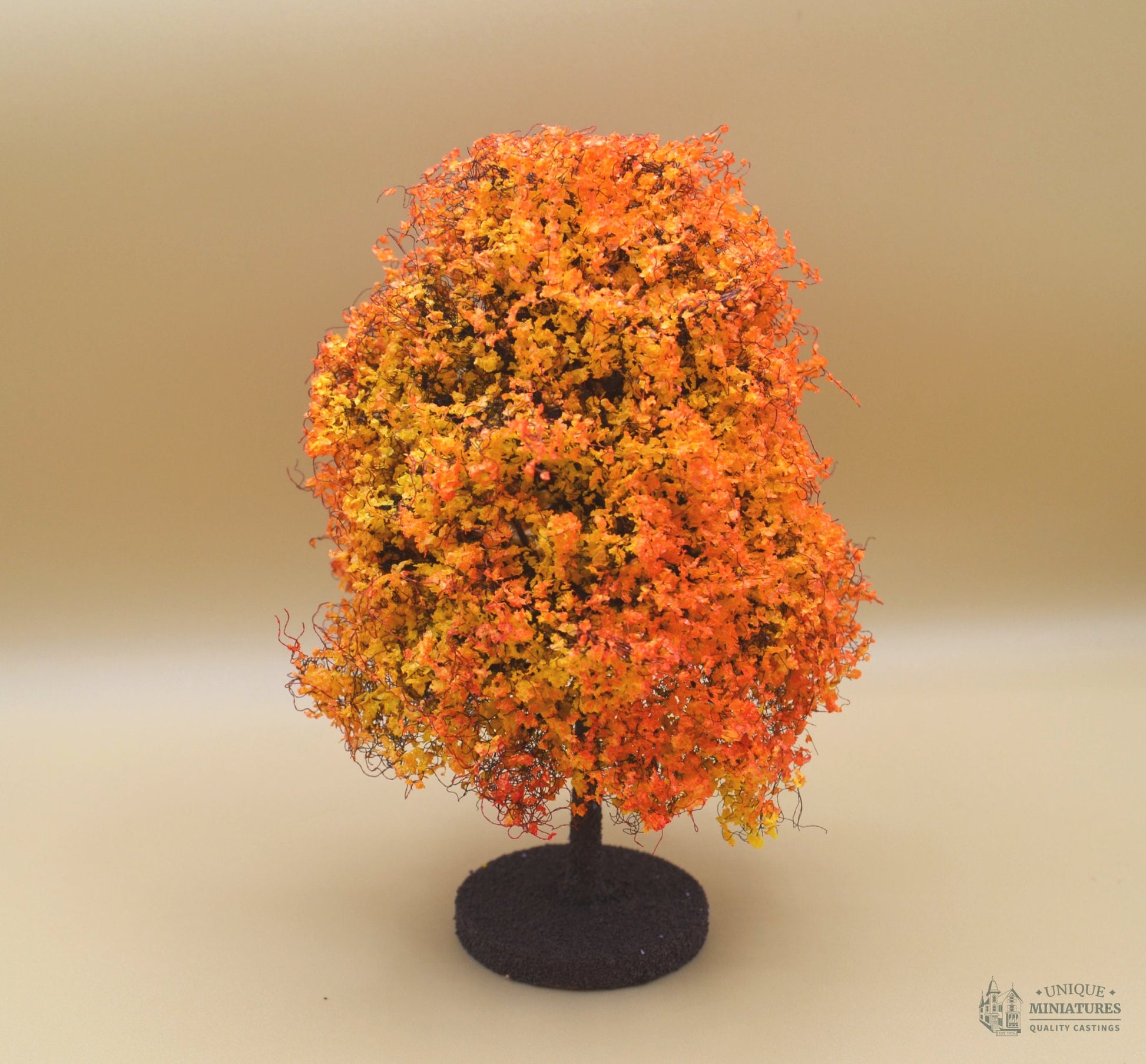 This miniature Orange Autumn Tree works perfectly in any outdoor miniature or dollhouse build.It comes with a rounded base. The tree measures 6 1/2" Tall x 4" Wide x 4" Deep.