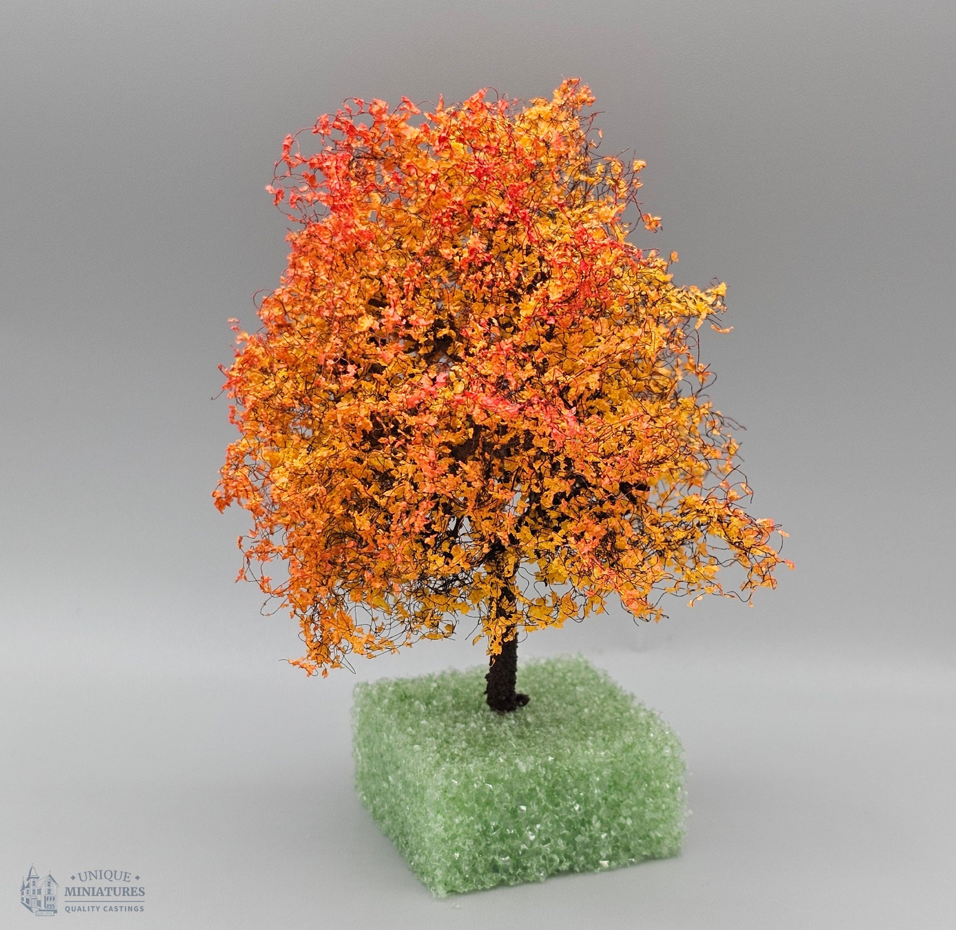 This miniature autumn tree works perfectly in any outdoor miniature or dollhouse build. It comes with a spiked end so it can be easily installed in a variety of bases. The tree measures 4" Tall x 4" Wide.